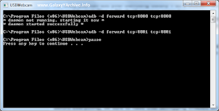 Now connect your Galaxy Y to your computer with the USB cable, then on your computer go to the folder where the USB Webcam program got installed and run the batch file.You should see the following text: